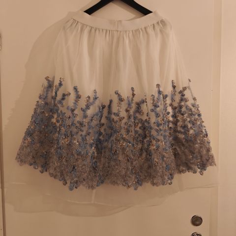 Paita käyttämätön. Hametta pidetty kaksi kertaa. Puuvillaa. Hameessa ohut vuori. Hameen pituus 84 cm. Vyötärö 74 cm. Sivussa vetoketju. Paidan pituus 73 cm. Kainalo-kainalo 45 cm.