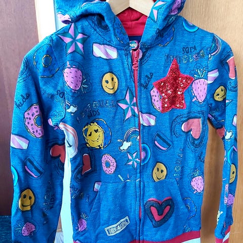 3 kpl Desigualin T-paitoja koossa 11-12, yhdessä vetoketjullinen tasku edessä ja kahdessa käännettävät strassit. Harmaassa tähtikuvioisessa jonkin verran pesunukkaa. Koiratalous.