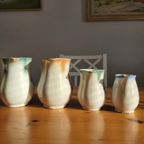 Isoimmassa kannussa sisällä (näkyy kuvassa) ns.halkeamaa pitää vettä kylläkin.Ja ulkopuolella ns.kulumaa joka lähtee ehkä esim. universal stonella.Pienin kannu/kermakko tosi nätti.