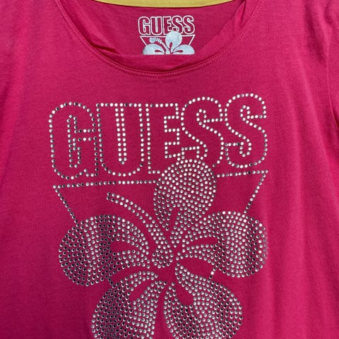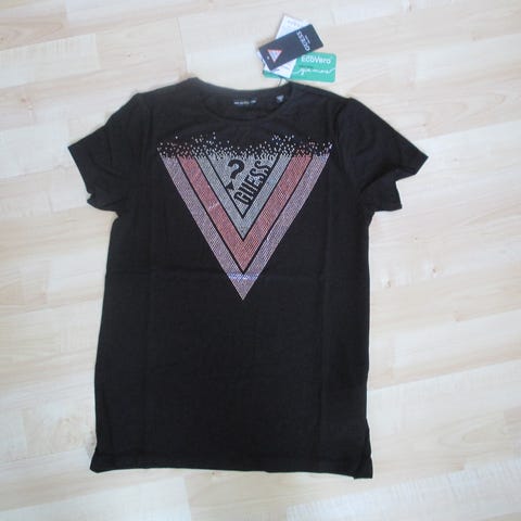Guessin söpö kissakuvioinen T-paita, koristeena strasseja ja pieni tyllirusetti. Koko 12-14 (pienehkö). Ei mainittavia käytön jälkiä, kaikki strassit tallella. Koiratalous.