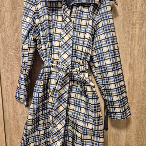 Kuvanmukainen kirjava kevyt sadetakki. Huppu ja vetoketjutaskut.