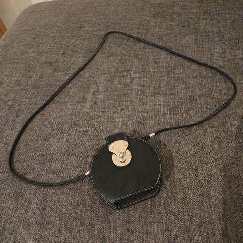 Tölkkien klipseistä tehty pieni pyöreä pikkulaukku. Vetoketjullinen ja rannehihnalla.