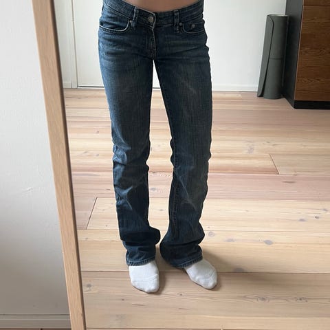 Oikeassa lahkeessa on pieni kuluma, mutta muuten farkut ovat hyvässä kunnossa.