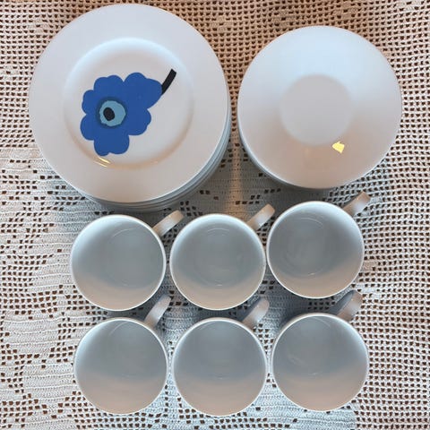 Marimekon Maija Isolan suunnittelemat siniset Unikko kahvikupit. Kupin korkeus 6,5 cm, halkaisija 8 cm. Vetoisuus 18 cl. Myydään yhdessä.