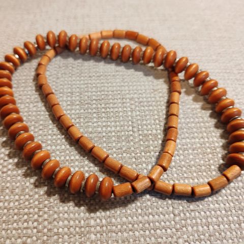 Kuvanmukainen vanhempi Aarikan kaulakoru, jossa puunväriset puuhelmet ja venyvä nauha. Pituus n 72 cm. Hyväkuntoinen.