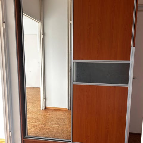 Ehjä vaatekaappi 3 ovella, joista 1 peiliovella. Ostettu Tasokalusteesta. Ollut eteiskaappina ja nyt makuuhuoneessa. Hyllyt ja vaatetanko.