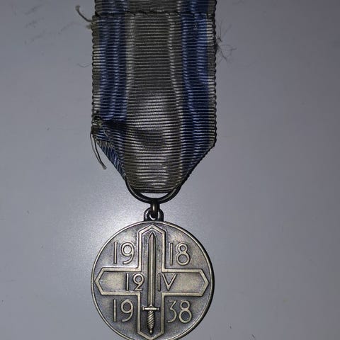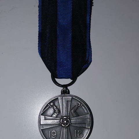 Suomalainen 1918 muistomitali, metallista valmistettu, mukana kaksivärinen nauha. Mitali on historiallinen esine, jossa on vuosiluku 1918 ja koristeellinen leijonakuvio toisella puolella. Sopii keräilijöille ja historian harrastajille. TARJOUS Huomioidaan. Lähtöhinta