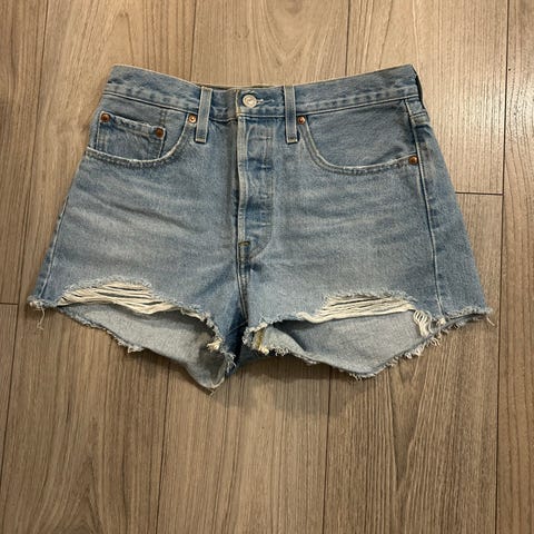 Leviksen vaaleansiniser farkkushortsit. Kokoa S (25 tuumaiset). Nappikiinnitys edessä. Olleet vähällä käytöllä joten käytönjälkiä ei ole