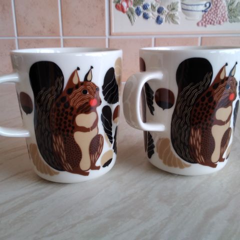 Kaksi mukia, eivät ole olleet käytössä. Tarrat ovat paikoillaan.