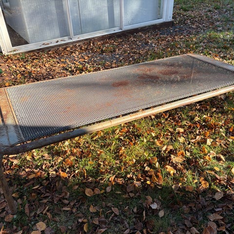 Ulkona vuosikaudet ollut, ruosteinen mutta ehjä heteka annetaan pois. Nouto Vihdin Jokikunnasta.