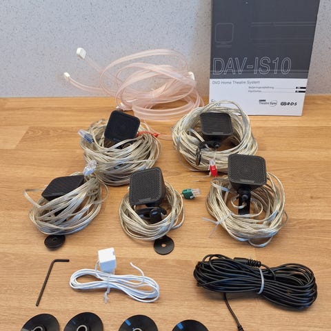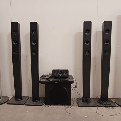 Kotiteatterijärjestelmä, 5 pientä ja 1 iso kaiutin.Mukana tulee mikrofonivahvistin,josta puuttuu virtalähde.