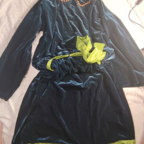 Keltainen täyspitkä prinsessa Belle puku olkaimilla, koko 140cm/7-9 vuotiaalle. Pukukankaan alla vyötäröstä alaspäin valkoinen tylli. Selkäpuolella vyötäröllä kuminauha. Käsineet, yläosassa kuminauha pitää paikoillaan, alaosassa sormeen pujotettava koriste ruusuke kuminauhassa. Käsineiden etuosan keskellä pituus n.33,5cm, takaosan sauman kohdalla n.30cm. Puvun ympäri kiertää koristenauha, edessä ja takana kaksi koristeruusuketta, molemmissa sivusaumoissa yksi koristeruusuke. Vyötäröstä edestä keskeltä pituus helmaan n.86,5cm. Yläosan alareunassa vasemmalla sivulla kyljessä brodeerattuna Bellen nimi. Käsinpesu, silitys yksi piste. Käyttämätön.