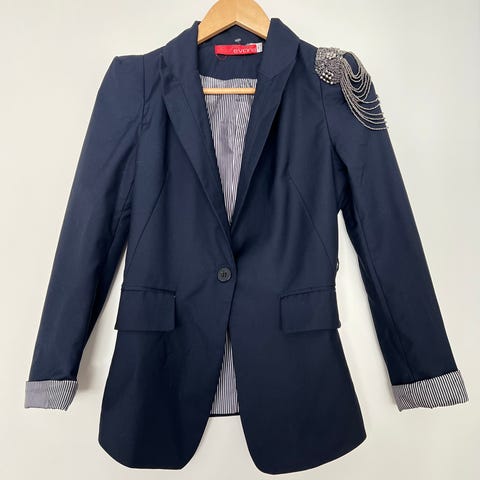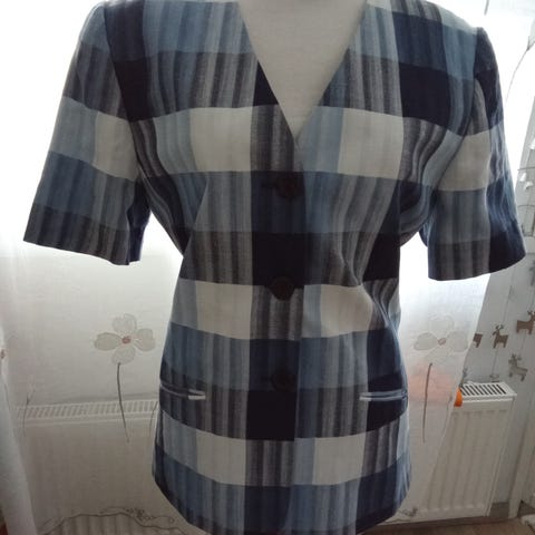 Ihana, valkoinen bleiseri, jossa ohut vuori.Edessä taskut,joita ei ole edes avattu.Kokolapussa lukee L, mutta kuten niin usein,se ei pidä paikkaansa,vaan pitää olla S-M.