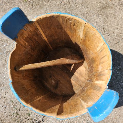 Siistikuntoinen vanha kalja saavi, vain puutappi hanasta puuttuu, muuten täydellinen. Korkeus 68cm ja halkaisija 43cm.