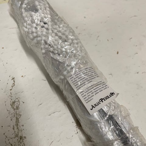 90 cm leveä, max 135 cm korkealle verholle sopiva laskosverhon mekanismi. Valkoinen kuulaketju, kolme lankanostoa ja käyttämätön velcro-nauha mukana, eli pehmeä kappale pitää vain ommella kiinni kankaaseen. Kangas tarvitsee lisäksi kovikerimat ja jonkinlaiset lenkit nostonauhoja varten. Laskosverhot ovat hyvä ja tyylikäs ratkaisu, jos tilaa sivuverhoille ei ole, katto on vino tms.