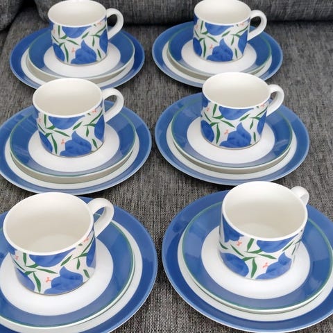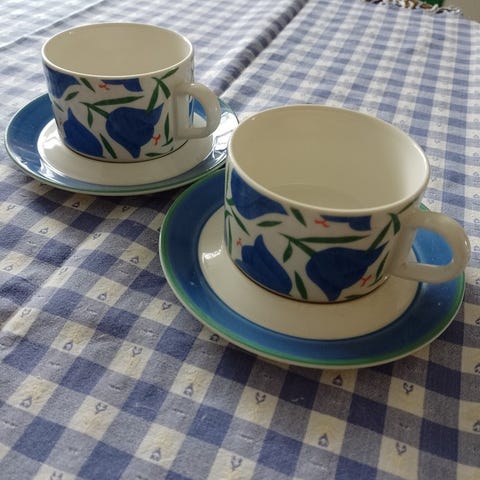 Arabia Balladi teekupit. Kupin korkeus 6cm, halkaisija 9cm, lautasen halkaisija 16cm. Suunnittelija Heikki Orvola.