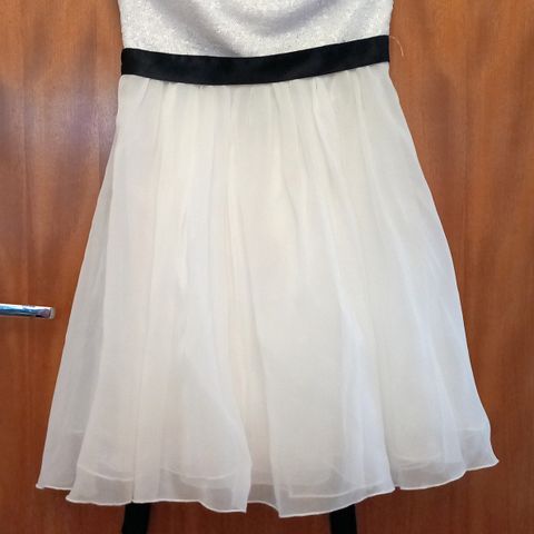 Musta rusettivyö, silkkimäinen. Säädettävät olkaimet, sivussa vetoketju.