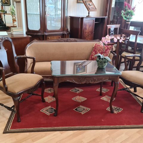 Huonekalutehdas Laitala Oy:n valmistama talonpoikaisrokokoo-tyylinen sohvaryhmä. 3-istuttava sohva, 2x nojatuoli ja sohvapöytä. Kunto erittäin hyvä. Beige kangas.