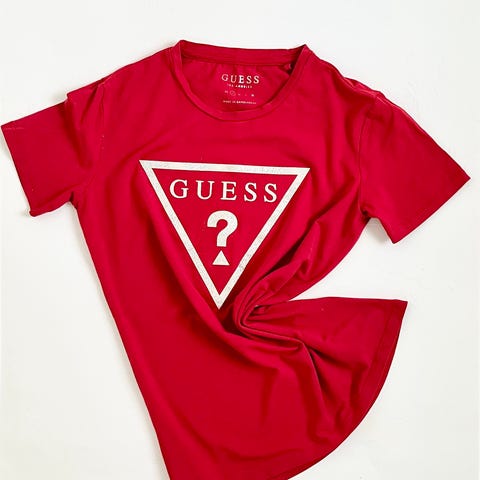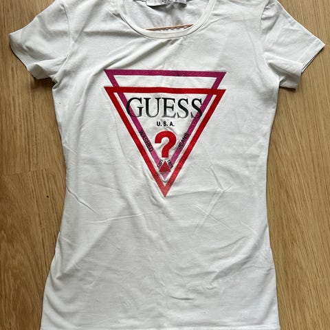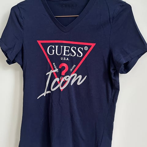 Musta Guess t-paita, koko S, edessä valkoisella teksti femme fatale, kevyttä ilmavaa kangasta.