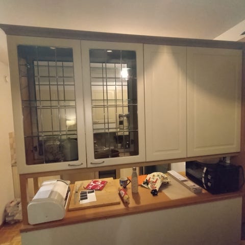 Keittiömaailma alakaapit ja välitilan lasi annetaan purkua ja noutoa vastaan. Taso tumma massiivipuu, nyt dc fix. Ovet kohtalaisessa kunnossa.