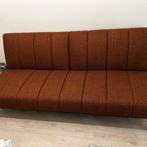 Askon mäntyinen, valkoiseksi kuultomaalattu Minea -vuodesohva /sohvasänky. Patjakoko 200 × 80cm, mukana tulee taittopatja, joka avattuna sängyn koko 200 × 160cm. Alla kaksi pyörällistä säilytyslaatikkoa.