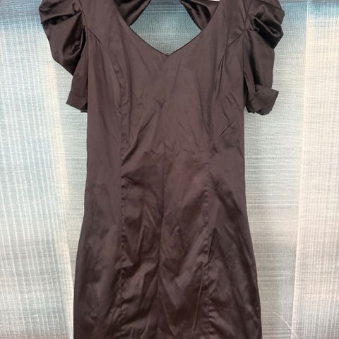 Musta satiininen juhlamekko. Koko 36. Taakse solmittava rusettinauha. Edessä röyhelö. Nouto Pitäjänmäki tai postitus.