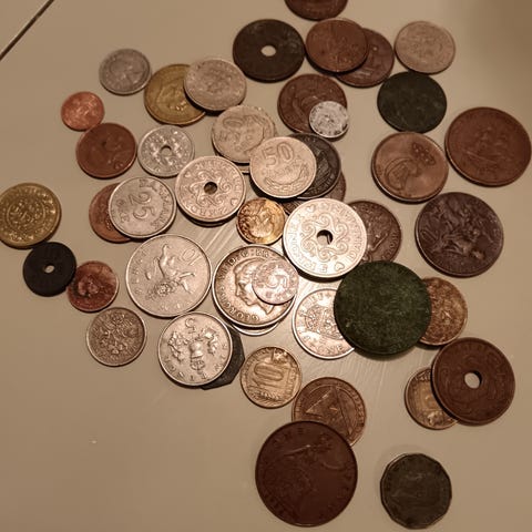 Myydään sekalainen erä vanhoja kolikoita, yhteensä 24 kappaletta. Mukana eri maiden rahoja eri vuosikymmeniltä. Sopii keräilijälle, askarteluun tai vaikkapa sisustukseen.