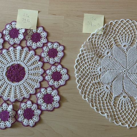 Lautasliinat kangasta ja pöytäliina, kaikki käsityötä.