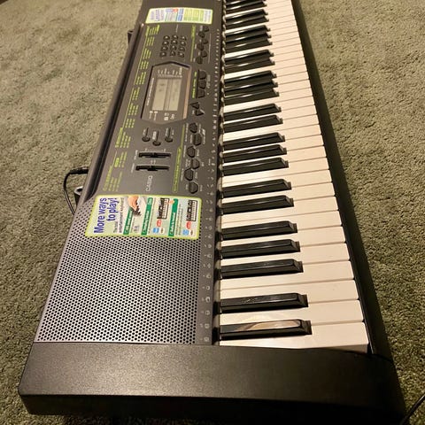 Ethän tingi kiitos. Kosketinsoittimet Casio LK-45. Lukuisia valmiita soundeja, kappaleita ja rytmejä. Key lightning system, jonka avulla voi opetella soittamaan. Koskettimiin syttyy punainen valo kun niitä pitää painaa. Näppärä ja monipuolinen kosketin soitin. Ei vie niin paljon tilaa kuin piano ja on helposti siirrettävä. Tarvitsee kaapelin, 10-15 euroa.
