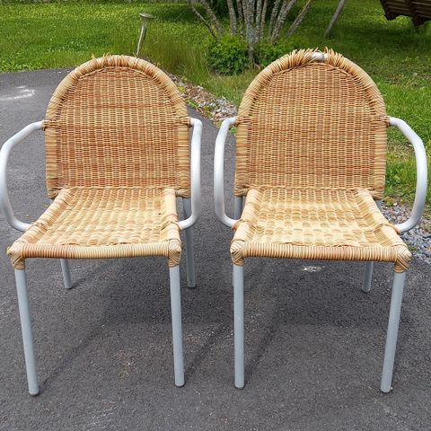 Kahden istuttava rottinkituoli, pari ripaa rikki. Ei haittaa käyttöä.