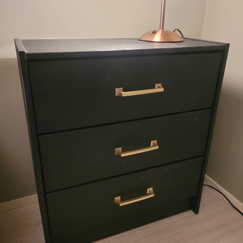 Keittiökaapista tehty lipasto mäntyisellä liimapuukannella. Kuulalaakeroidut laatikot. Umpitammiset jalat.