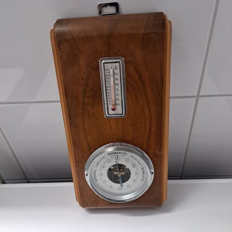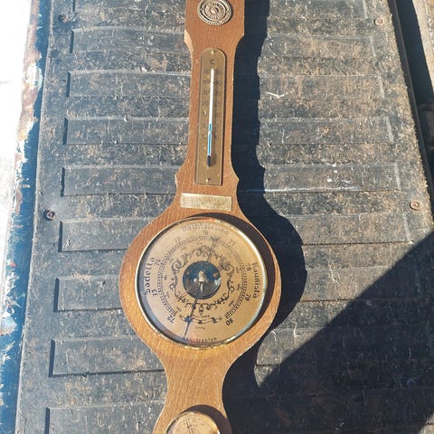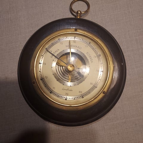 Kaunis vanha ilmapuntari. Ruorista puuttuu yksi sakara. Viisari liikkuu, mutta toiminnasta ei täyttä varmuutta. Ympyrän halkaisija 14,5cm.