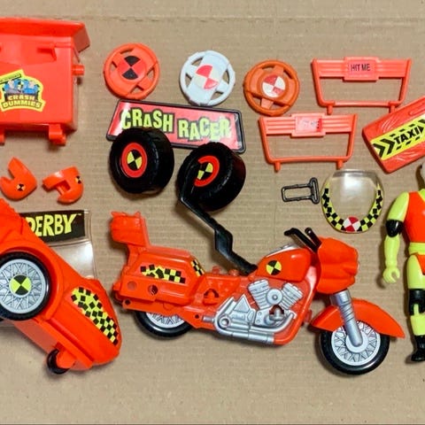 Crash Test Dummies motorcycle, figuuri ja kaksi kypärää. Figuurin jalka rikki. Pyörän tuulilasi puuttuu. Tyco 1991