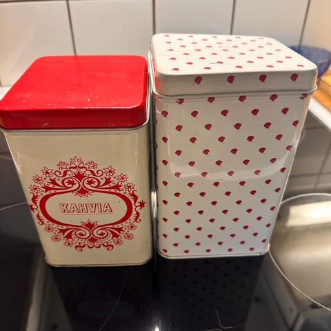Myydään kolme retrosäilytyspurkkia. Korkeudet 18,5 cm, 15 cm ja 12,5 cm. Mahtuvat kaikki toistensa sisään.