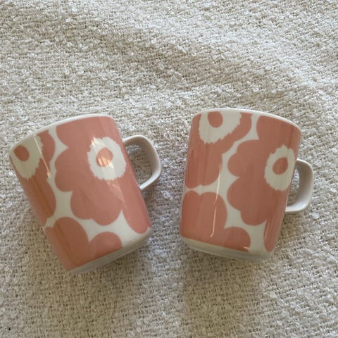 Uudet ja käyttämättömät Marimekon Oiva Unikko Japan Exclusive isot mukit, 4dl ja lautaset 20cm. Väri puuteri / tummansininen / valkoinen.