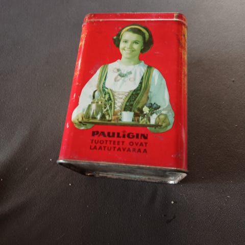 Kuvan kohtalaisen kuntoinen Paulig kahvipurkki.