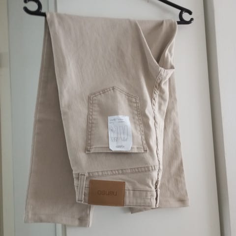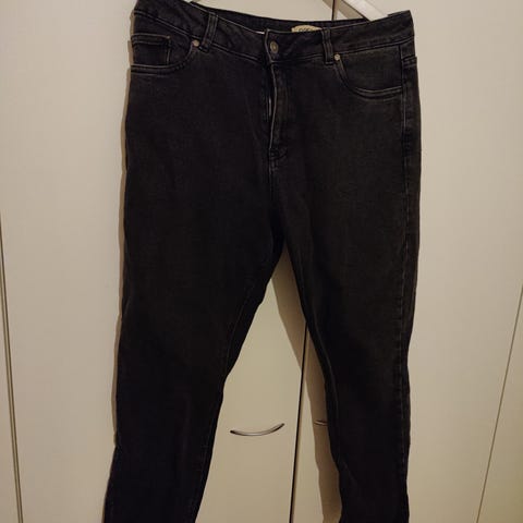 Myydään Nanson Kantti -farkut. Takana valetaskulistat. Lähikuva vääristää väriä, väri on tasaisen musta.