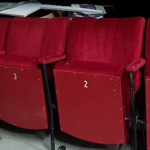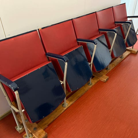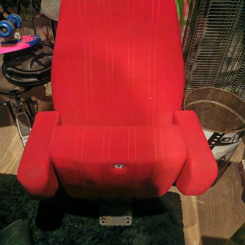Myydään vanhat elokuvateatterin tuolit. Punainen keinonahka, vihertävät metalliosat, puiset kädensijat. Istuinosa nousee ylös, kun tuolilla ei istuta. Säilytystä varten purettu osiin. Mukaan saa halutessaan täyspuisen levyn, jossa tuolit olleet kiinni. Levy maalattu kiiltovalkoiseksi.