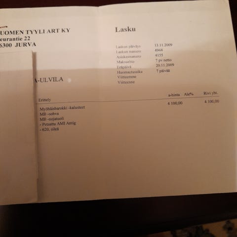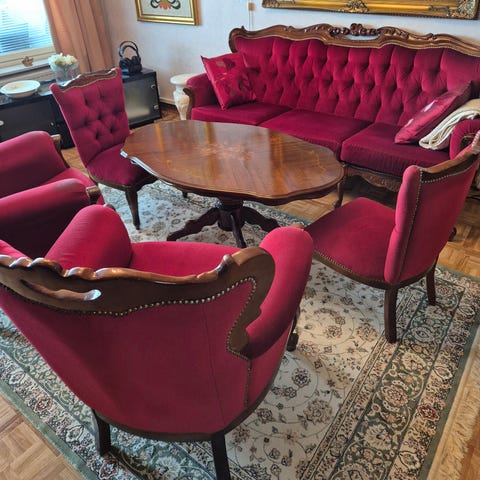 Myöhäisbarokki kalustesarja, 3-istuttava sohva + 2 nojatuolia + pöytä + villamatto. Sarja on kuin uusi, ollut erillinen huone kalusteille eli olleet lähinnä koristeena. Taloudessa ei ole ollut koskaan lemmikkejä tai lapsia. Ostokuitti on edelleen tallessa, kruunukalusteesta ostettu aikoinaan. Sohvan koko: L.180 K.80 S.80 (istumasyvyys 50). Nojatuoli: L.70 K.80 S.80. Mitat noin mittoja, koska kalusteet erikokoisia eri kohdista, tässä maximi mitat. Pöydän koko: L.66 P.97 K.58.