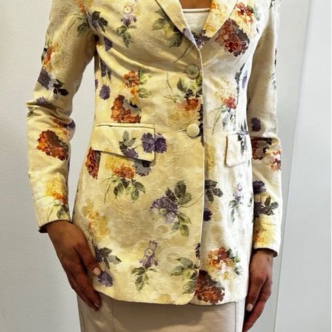Ulkomailta ostettu, mutta käyttämättä jäänyt kaunis kukallinen bleiseri. Materiaali joustaa hieman, ei kiinnitystä edessä.