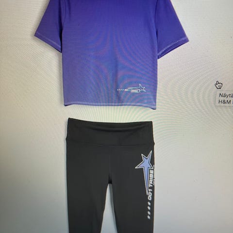 H&M -treenisetti. Trikoot ja toppi. Säilytyksestä rypyssä. Muutoin oikein siisti, mutta pari pientä pisaraa ilmeisesti kynsiliimaa tippunut. Ei haittaa käyttöä. Koko 134/140.