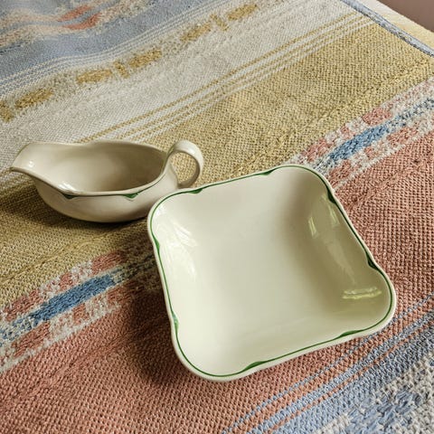Myyn Arabian vanhaan astiastoon kuuluvan ison paisti-/tarjoilulautasen (halkaisija 35 cm) sekä kastikekannun (vetoisuus 0,5 l). Lisäksi mahdollista saada samaan sarjaan kuuluva soikea tarjoilukulho (ei kuvaa). Astiat ovat hyväkuntoisia, kuviointi ja kultaus säilyneet hyvin.