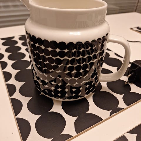 Myydään hyväkuntoinen lähes käyttämätön Marimekon keraaminen kannu 1,25L, ei ole enää tuotannossa. Korkeus 15cm, halkaisija 11cm. Kaunis kuosi on Aino-Maija Metsolan suunnittelema. Ihana kuviollinen vesikannu sopii esimerkiksi joululahjaksi! Iittala arabia artek aarikka joululahja