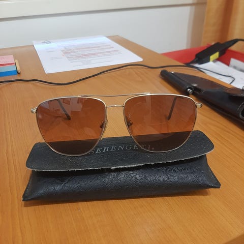 Hyväkuntoiset ja naarmuttomat aurinkolasit Serengeti-laatua (made in France). Linssit kirkkaat ja siistit. Mukaan alkuperäinen kotelo, joka on kulunut mutta ehjä.