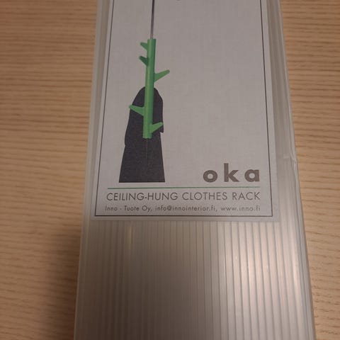Teppo Asikaisen suunnittelema Oka-naulakko tuo raikkaan piristyksen sisustukseen leikkisällä muotokielellään, eikä vie ollenkaan lattiatilaa, sillä se riippuu vaijerin varassa katosta. Oka-naulakossa on 6 koukkua ja korkeudensäätömekanismi.