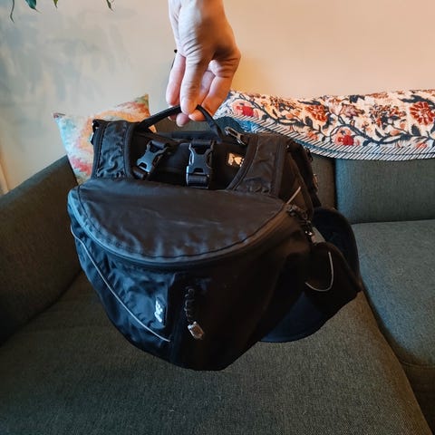 Tummansininen reppu, jonka koossa reilusti säätövaraa. Sopii arviolta keskikokoisesta jättikokoiseen koiraan. Useita taskuja.