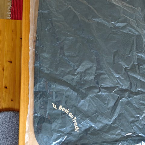 Ohut tikattu alusta, joka kestävää ja hieman joustavaa materiaalia. Molemmat puolet samanlaiset, eli käännettävä. Koiran hajua on.