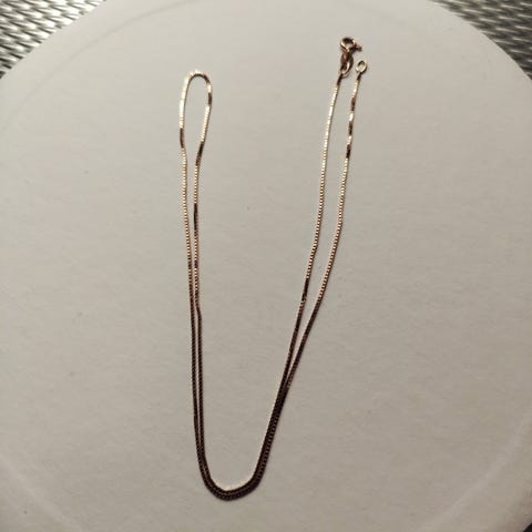 Ketjun pituus 45cm, paksuus 1mm, paino 2,4g. Vain pari kertaa käytetty, joten uuden veroinen.
