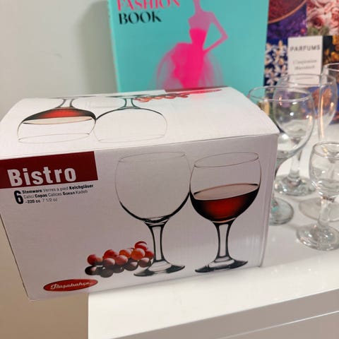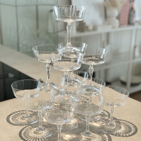 Juomalasit ovat helposti pinottavia, saa pieneenkin tilaan näppärästi ja kauniisti esille. Kaikki ovat kirkkaita, siistejä ja ehjiä. Tyylikäs setti juhliin.