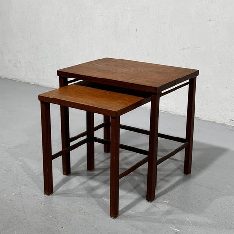 Tiikkiä. Yhdistetyt jalat. Pöytäryhmän isoin pöytä: Leveys 57 cm. Korkeus 54cm.